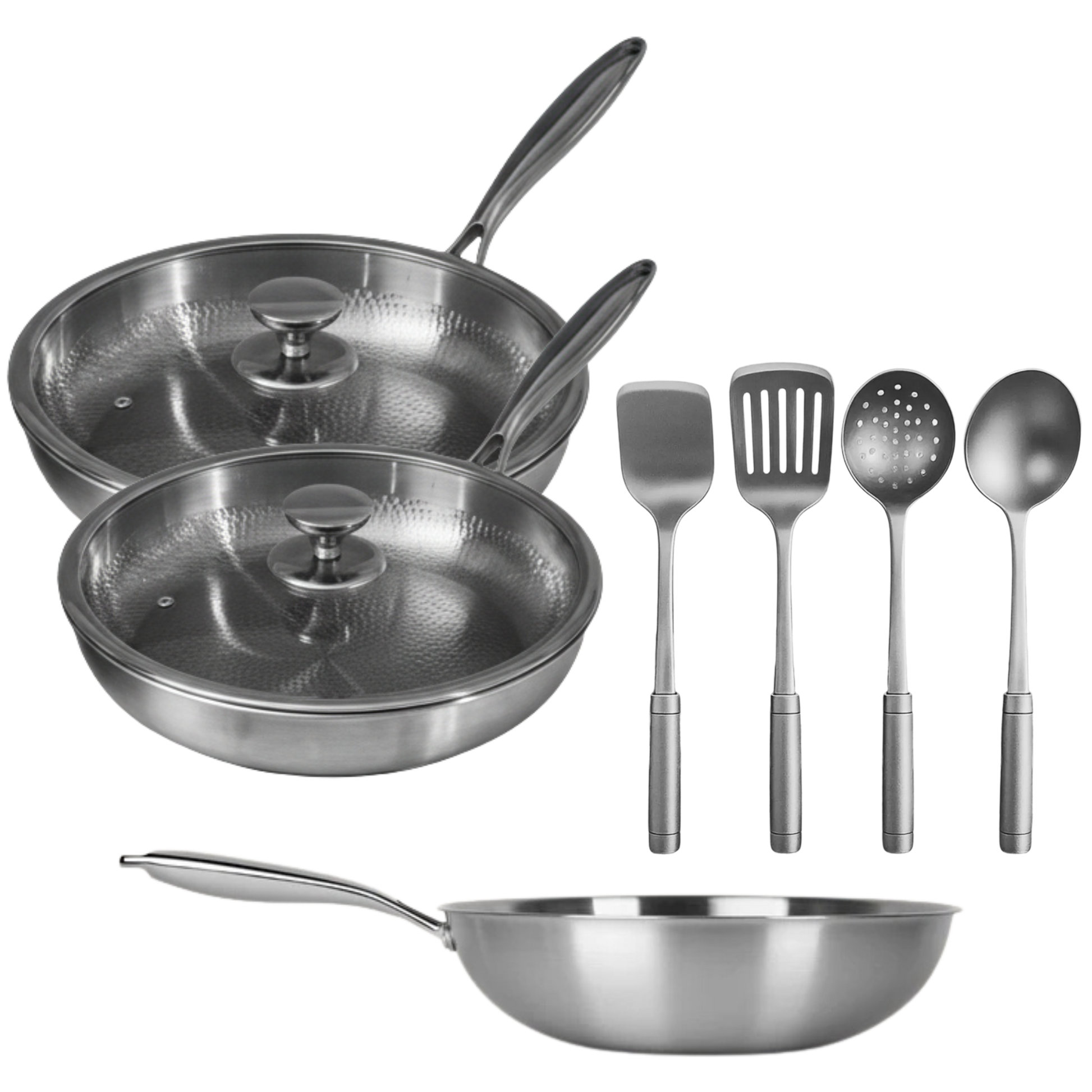 Het geborstelde oppervlak met titaniumafwerking geeft een moderne en verfijnde uitstraling die elke keuken verrijkt, terwijl de meerlaagse constructie zorgt voor een uitstekende warmteverdeling, een langere levensduur en betrouwbare prestaties bij dagelijks koken.