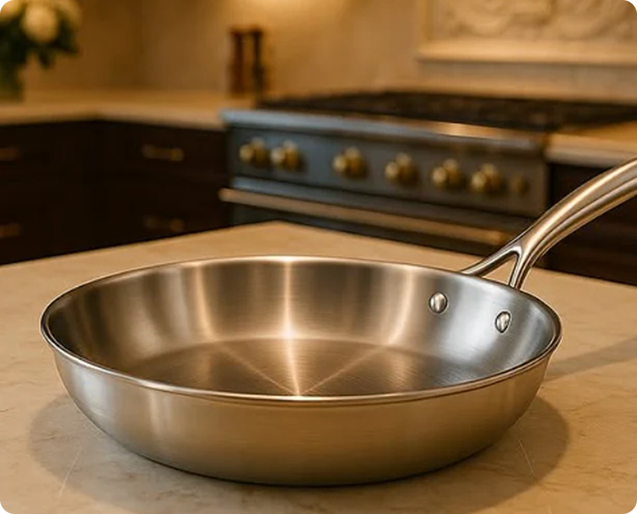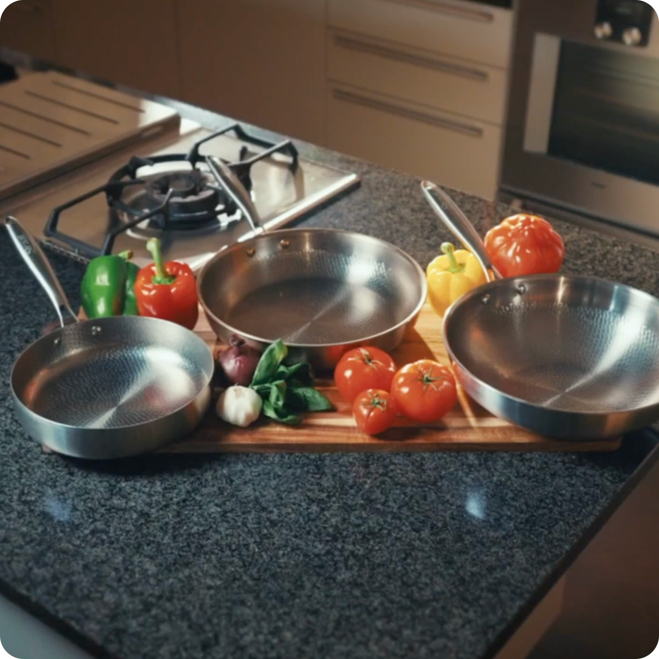 De pannen van puur titanium weerstaan extreme temperaturen tot 260°C (geschikt voor de oven) zonder te vervormen of achteruit te gaan. Puur titanium geleidt warmte snel en behoudt stabiliteit bij alle kooktemperaturen, van de vriezer tot het fornuis en de oven, wat zorgt voor constante kookprestaties gedurende tientallen jaren.